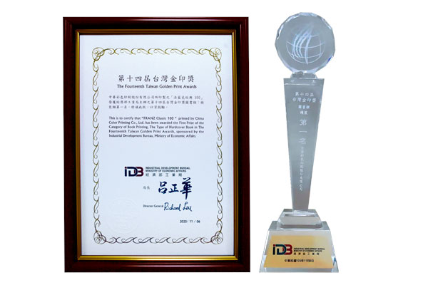 2020年11月6日第十四屆金印獎頒獎典禮,本公司承印《法藍瓷.經典一百》榮獲圖書類精裝第一名。追求卓越的品質是中華彩色的核心價值,能獲得業界專家評審們的肯定,除萬分感謝外,也將持續自我激勵,以朝最佳品質之目標努力邁進。